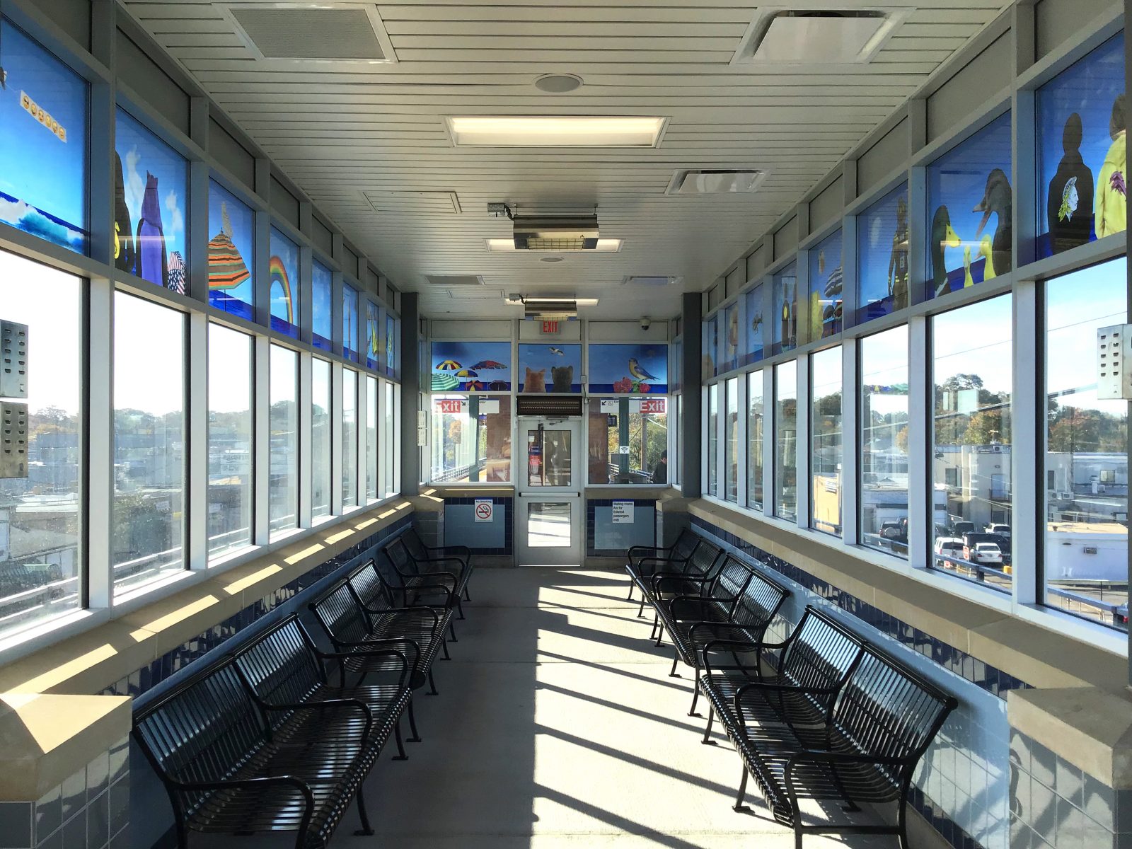 MD- I was awarded a commission by the MTA in 2016 to create artwork for the Long Island Railroad Wantagh / Jones Beach train station. It was a $32,000,000.00 complete renovation project of which I received a small percentage to come up with the idea to make the station a more happy place for commuters. I definitely felt honored to do this project. I thought long and hard about the ideas; having visited Wantagh and Jones Beach talking with local residents in restaurants in and around the station I believed I arrived at an effective approach. I created thirty hand-painted glass windows to surround the entire waiting room and two large mosaics on the east/west staircases. The glass windows comprise imaginative scenes of fun and symbolic images of the magic of the town of Wantagh, the beach, and local flora and fauna. The mosaics display two distinct images of the sea – one at sunrise, the other at sunset. They give off a nice mellow golden shimmer effect in the right lighting. The project was finally completed in November of 2018. I hope the windows and mosaics provide daily smiles and feelings of peace to commuters.